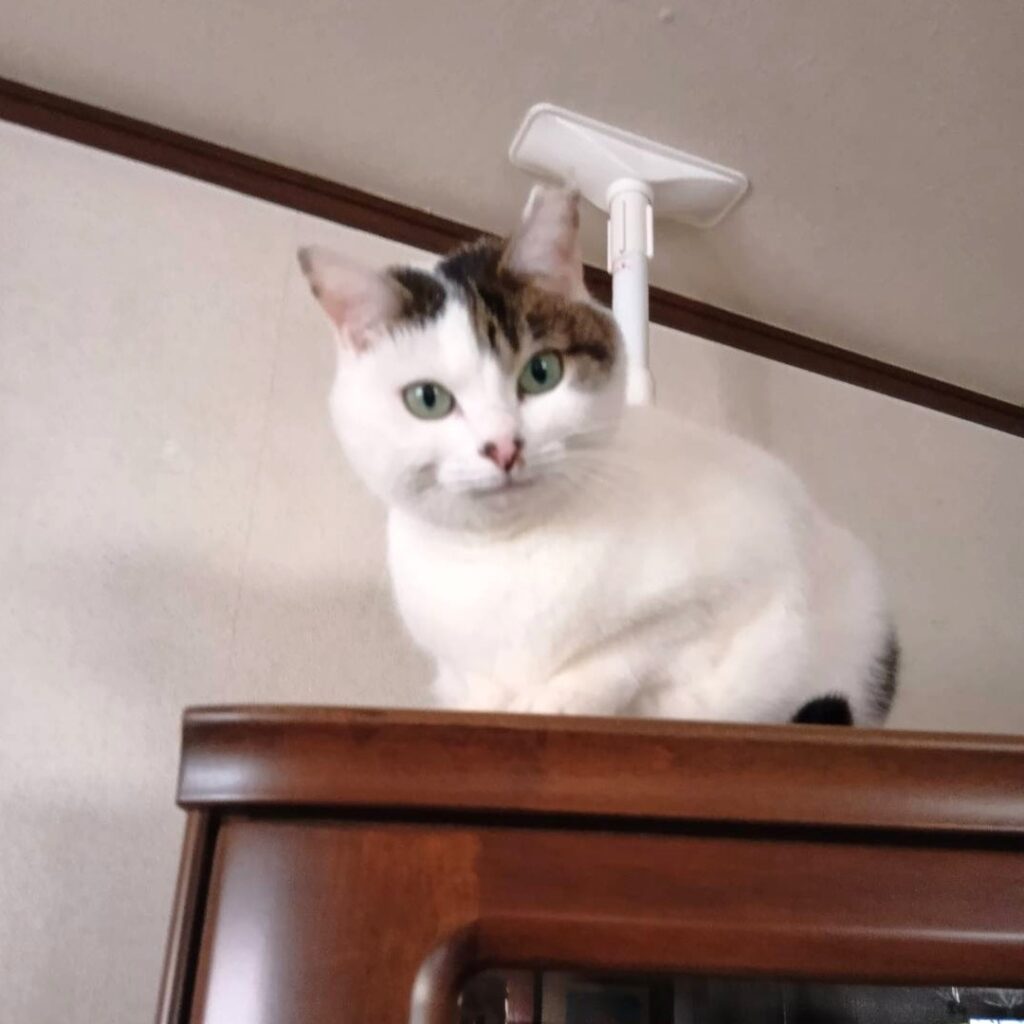義理のお母さんのおうちでは、棚の上など高い所に登って走り回ったり、かなりのお転婆さんなのですが、人見知りがとっても強く、来客があると隠れてしまい、なかなか姿を見せてくれません。