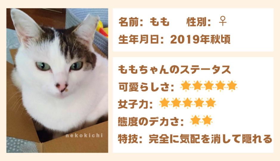 ももちゃんも保護猫さんで、ねずこやスピカと同じ保護猫団体さんから譲渡してもらいました。